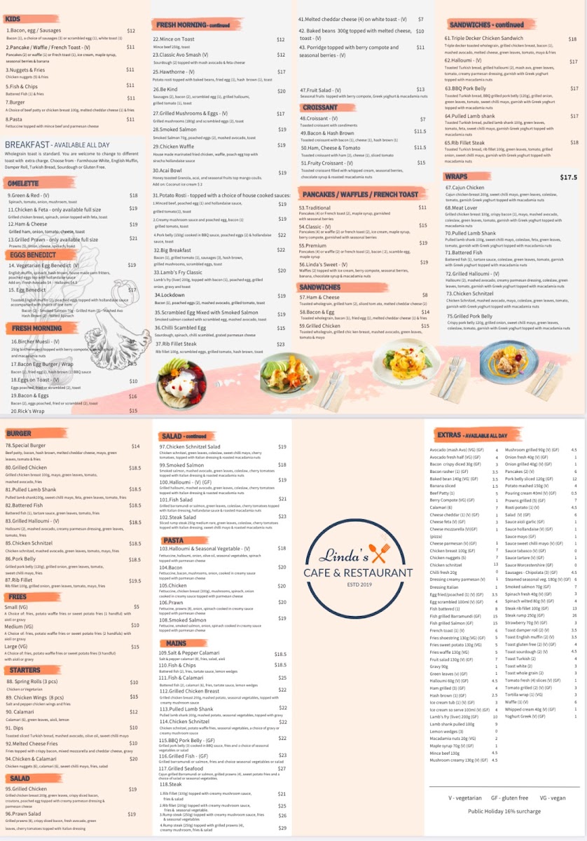Linda's Cafe also shines with its lunch offerings, featuring wraps like the Cajun Chicken and Meat Lover Wrap, both generously filled and bursting with flavors that will make your taste buds sing. The wraps are complemented by a healthy side of coleslaw and garnished with Greek yogurt topped with macadamia nuts for a touch of indulgence.